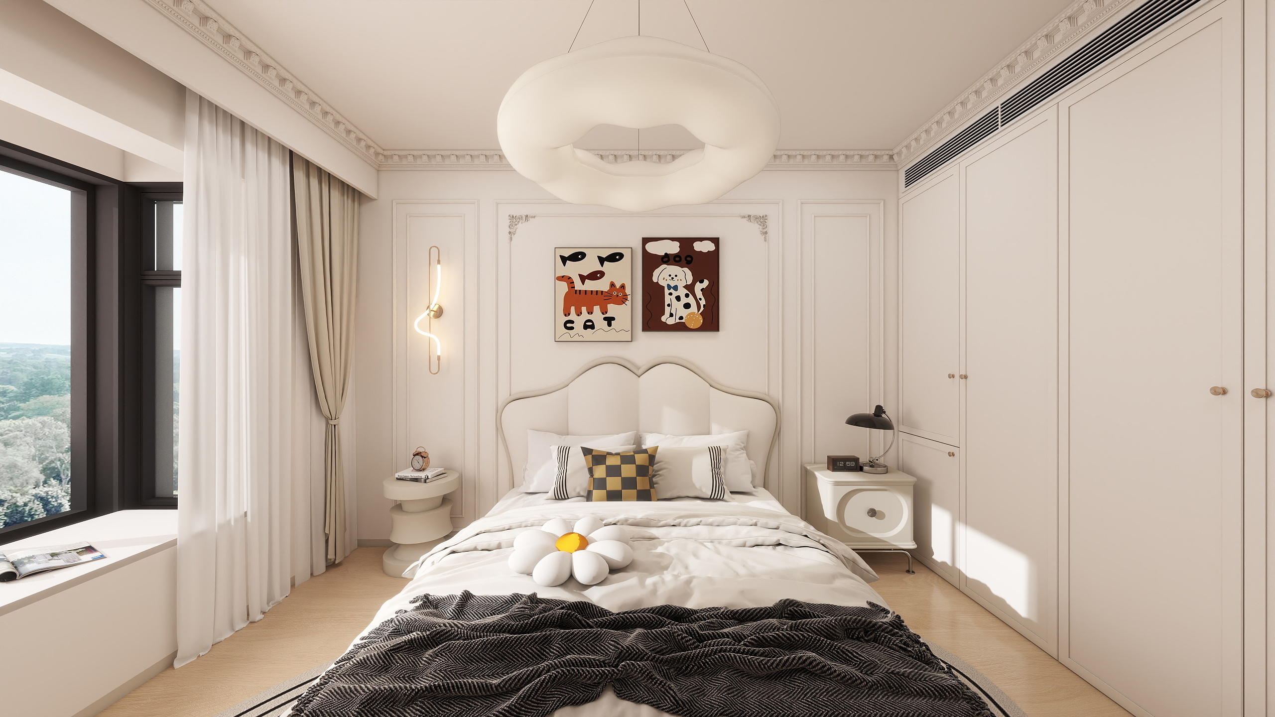 次臥淡雅的色彩營造出舒適的睡眠環境,簡約又溫柔,藝術漆墻面干凈舒適,印花靠背盡顯法式詩意優雅。床頭背景墻采用掛畫進行裝飾,增加空間的層次感,營造一種朦朧而溫馨的氛圍。