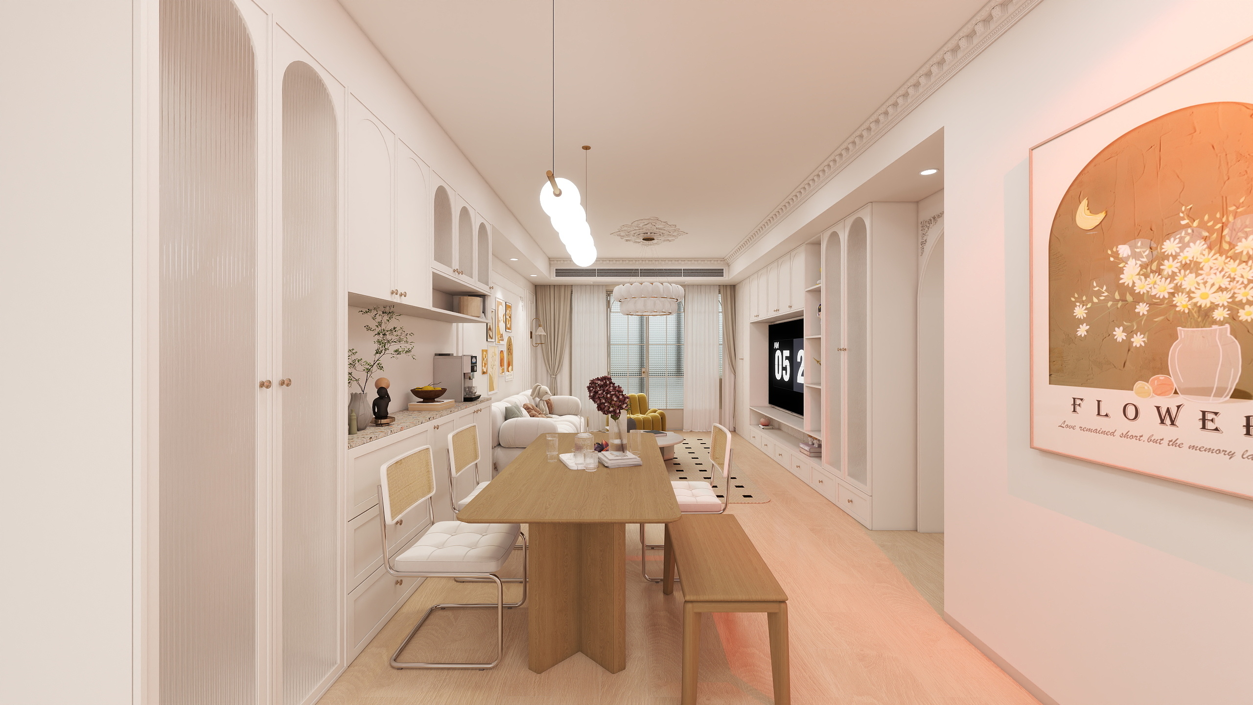 首先輕法式風格的客餐廳設計,是將傳統法式浪漫與現代簡約完美融合,營造一種寧靜而溫馨的氛圍。奶油色作為主色調,搭配淺咖或棕色進行點綴,使整個空間充滿了溫柔與雅致。