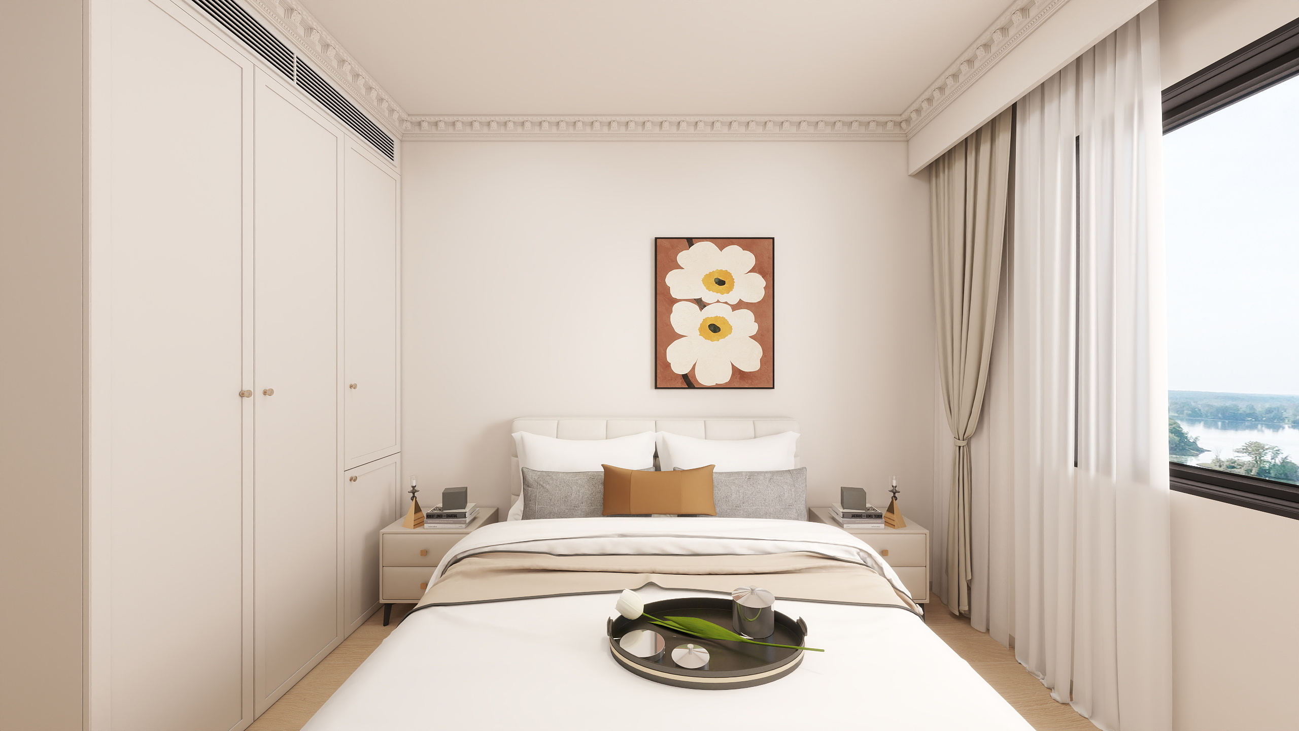 而輕法式臥室注重舒適與浪漫的結合,主臥這里是以淡雅的色彩和精致的細節來營造一種溫馨而寧靜的睡眠環境。同時墻面采用奶油色的淡雅色調,再搭配深色床品,增添復古韻味的法式古典氣質。