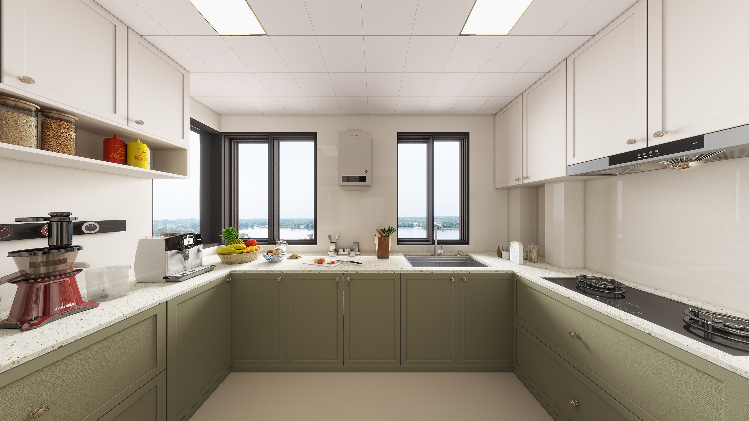 最后在這套老房翻新的廚房改造上,緣環設計師主要采用U型布局設計,既能充分利用空間,又可提高烹飪效率。同時,櫥柜顏色選用淺綠等淡雅色調,還能為整個空間增添幾抹質感和煙火氣。