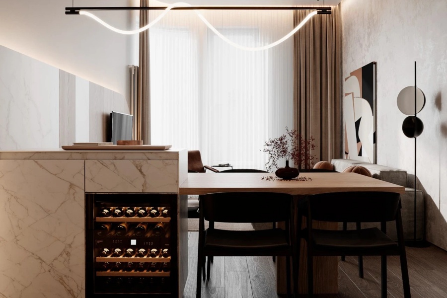 設計師采用島臺連接餐桌的一體化設計,島臺選用雪花白大理石臺面,底部嵌入黑色玻璃儲酒柜,兼具實用與輕奢感。原木餐桌與黑色皮質餐椅形成冷暖對比,頂部線性燈帶聚焦用餐區,提升空間層次。